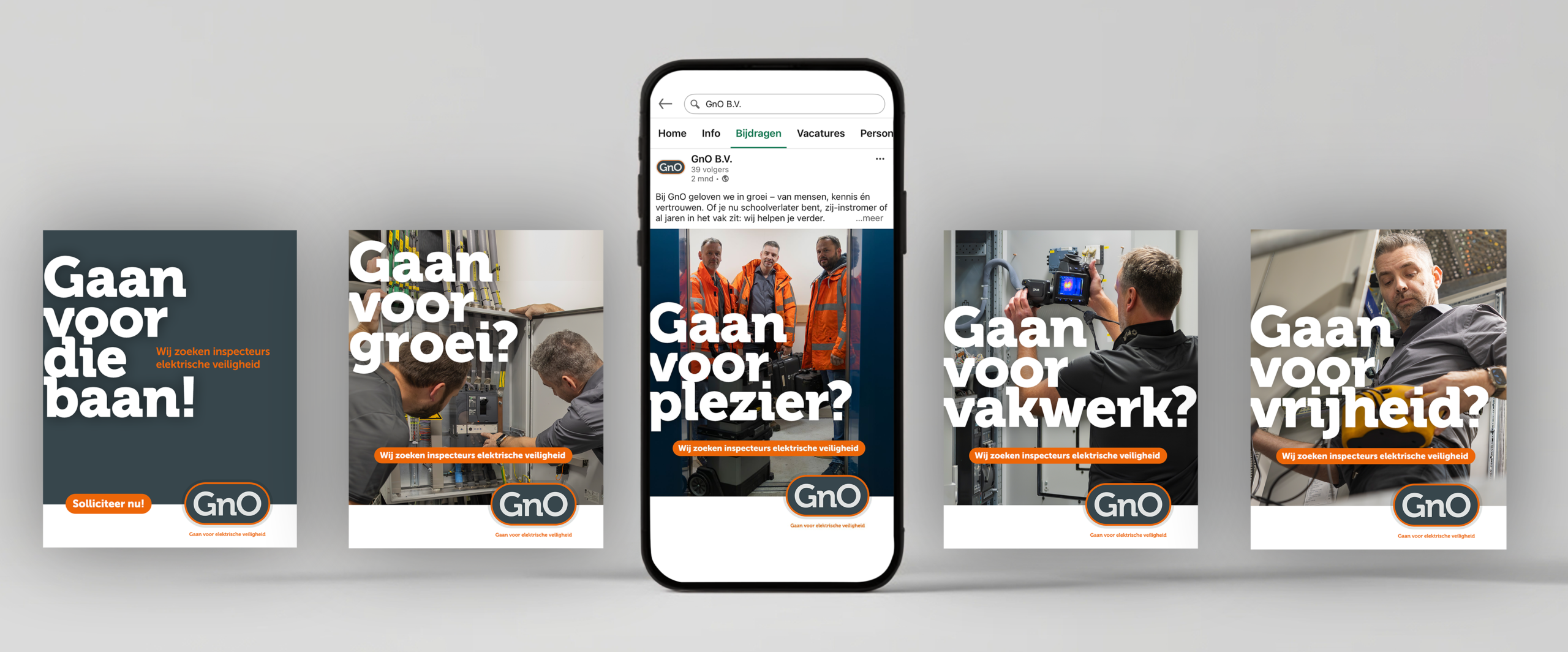 In nauwe samenwerking met de klant bedachten we GnO, een merknaam die past bij hun ambities. Door vanaf het eerste moment een visuele richting te tonen, hielpen we bij de keuze voor zowel de naam als de uitstraling. Het resultaat: een strak logo, een uitgebreide brandmanual en doordachte visuele communicatie. Daarnaast bedachten we de pay-off ‘Gaan voor elektrische veiligheid’, die de kern van de werkzaamheden goed samenvat.